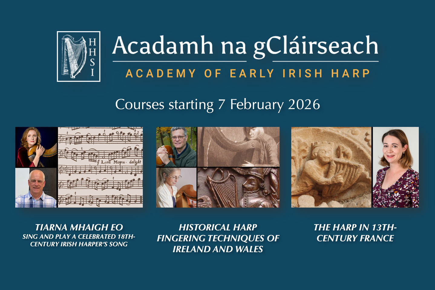Courses starting 7 February, 2026: Tiarna Mhuigh Eo: Sing and play a celebrated 18th-century Irish harper’s song; Historical harp fingering techniques of Ireland and Wales; The harp in 13th-century France