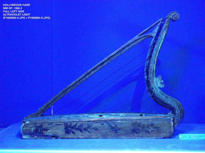 The Hollybrook is also a rare surviving example of an early Irish harp with a pieced soundbox and, according to the description in Robert Bruce Armstrong’s The Irish and the Highland Harps, was extensively decorated with golden motifs. The decorative work he described is not visible, so an interesting research challenge for this project was to see if it could be imaged under infrared or ultraviolet light.
