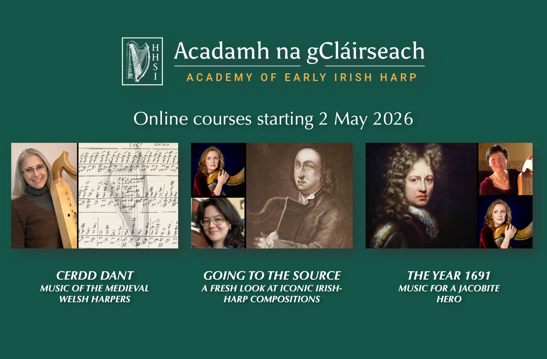 Courses starting 2 May: Cerdd dant: Music of the medieval Welsh harpers; Going to the Source: A fresh look at iconic Irish-harp compositions; The Year 1691: Music for a Jacobite hero